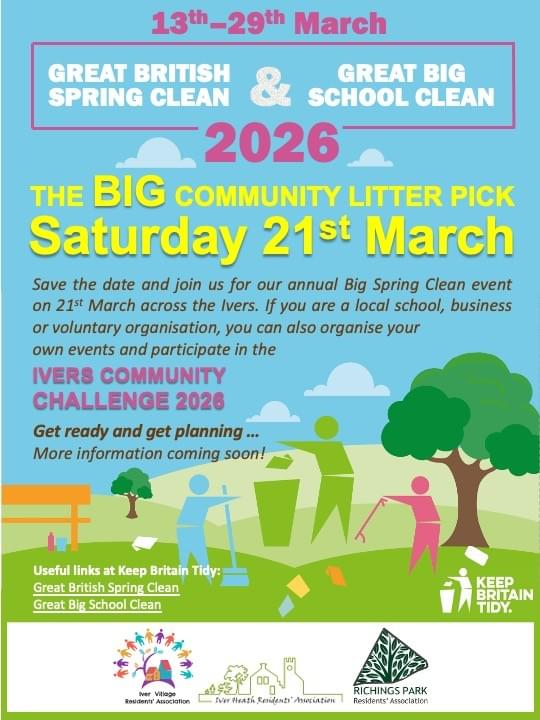 Once again, volunteers across the Ivers will be taking to our streets and green spaces for a massive rubbish clear-up. Part of the Great Britain Tidy organisation's nationwide initiative, the Ivers Parish is aiming to set the standard for taking pride in the environment.